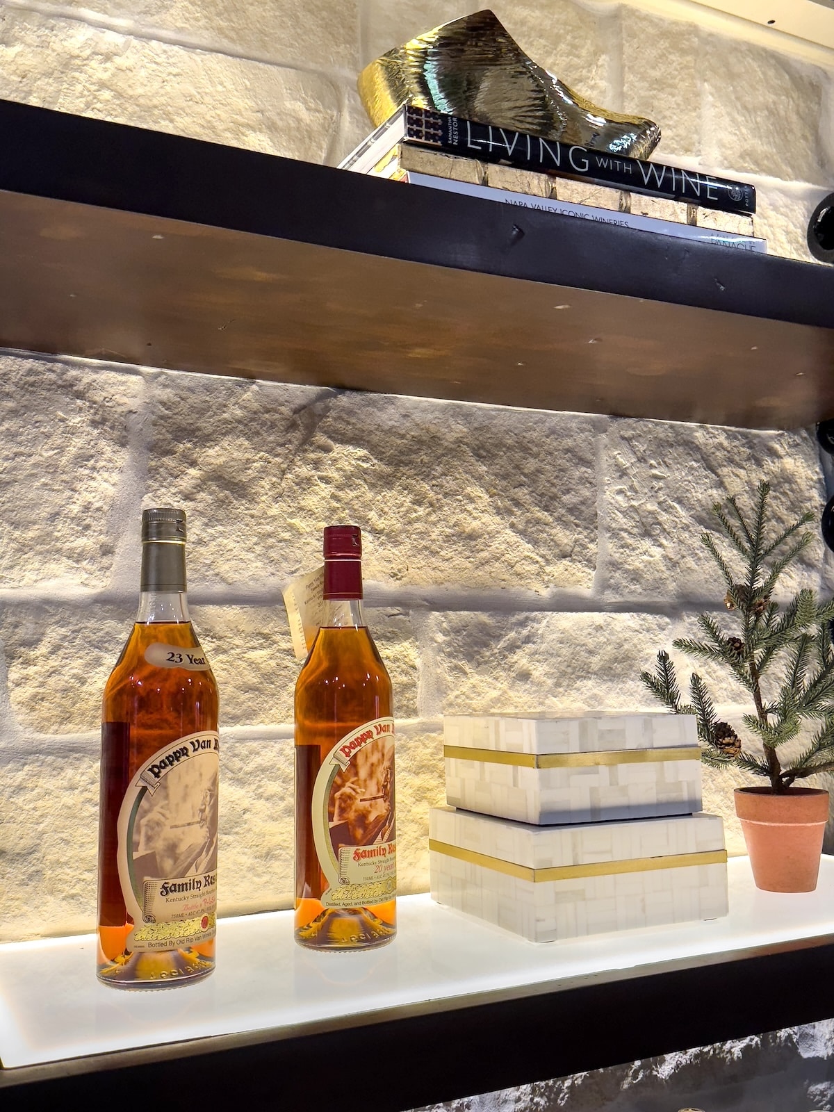 Every inch of this cellar was designed with purpose. Floor-to-ceiling glass panels make the collection visible at all times, while custom steel and walnut racking add both durability and a touch of luxury. The back wall is a work of art itself—lined with beautiful limestone that’s been drilled to hold metal pegs for a floating effect.