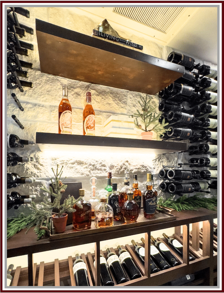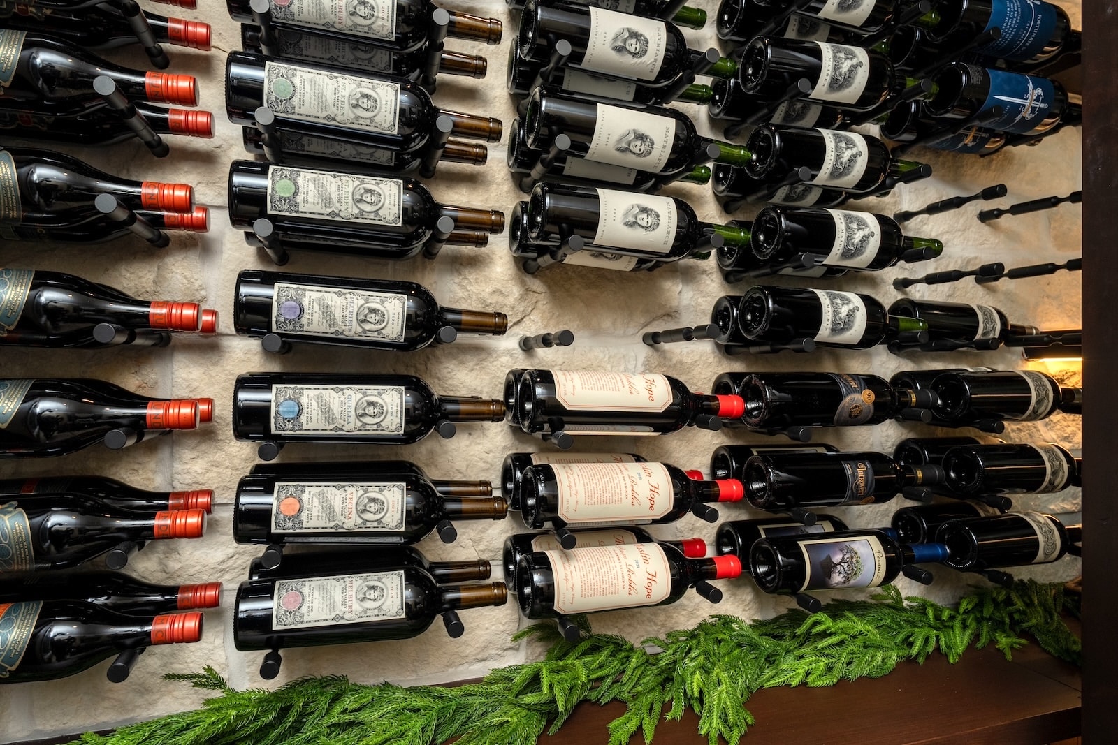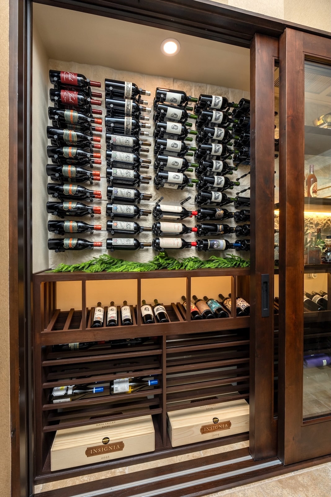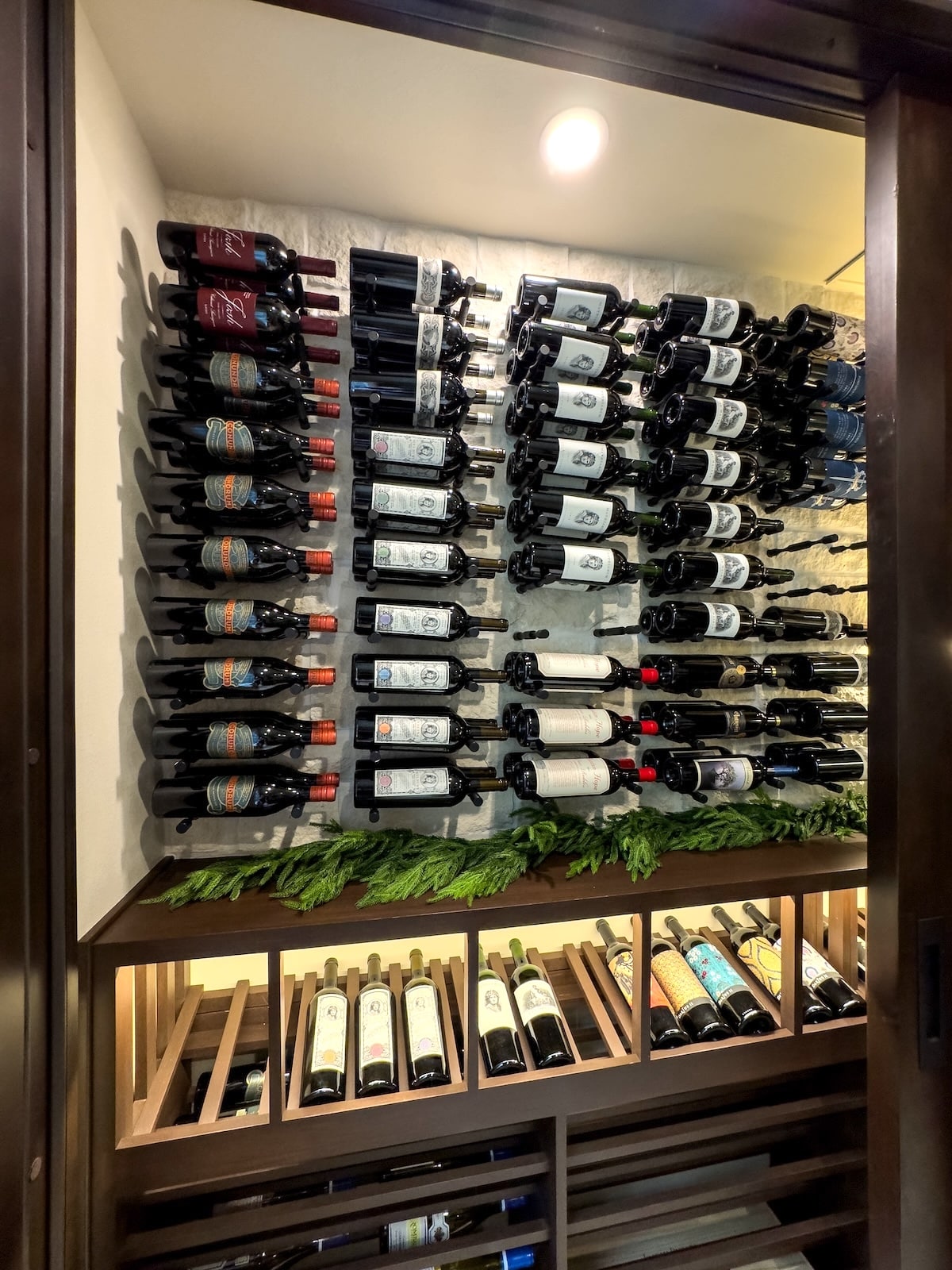 There are two types of racking here: sleek, double-deep metal pegs that keep bottles secure while maximizing space, and elegant Alderwood racks that have been stained and lacquered to perfection. Within the wooden shelf, you’ll find a reveal row, horizontal displays, and dedicated space for case storage—because let’s be honest, some wines deserve a little extra spotlight.