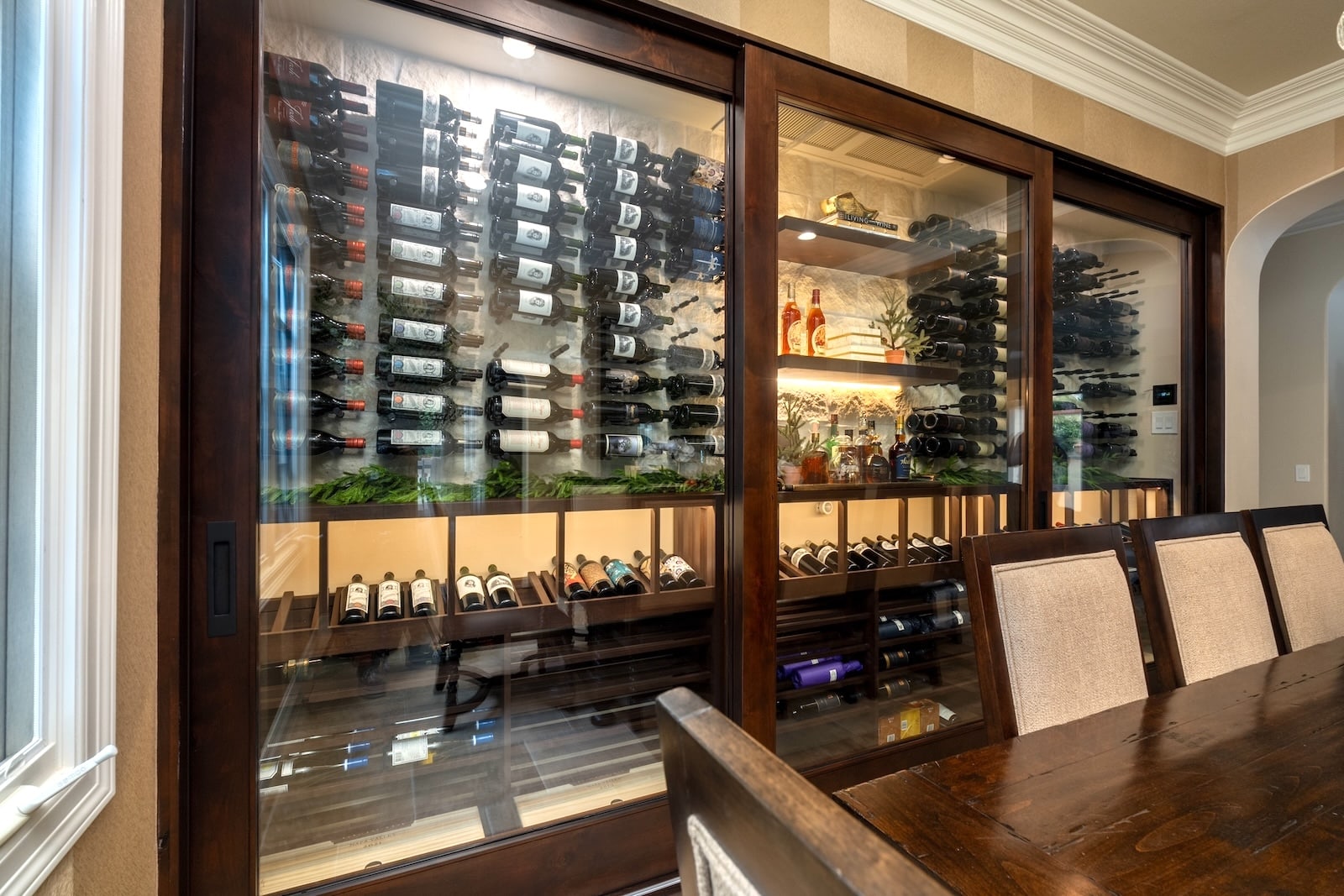 With tall glass panels, this glass dining room wine cellar transforms the wine collection into a stunning focal point while maintaining ideal storage conditions.
