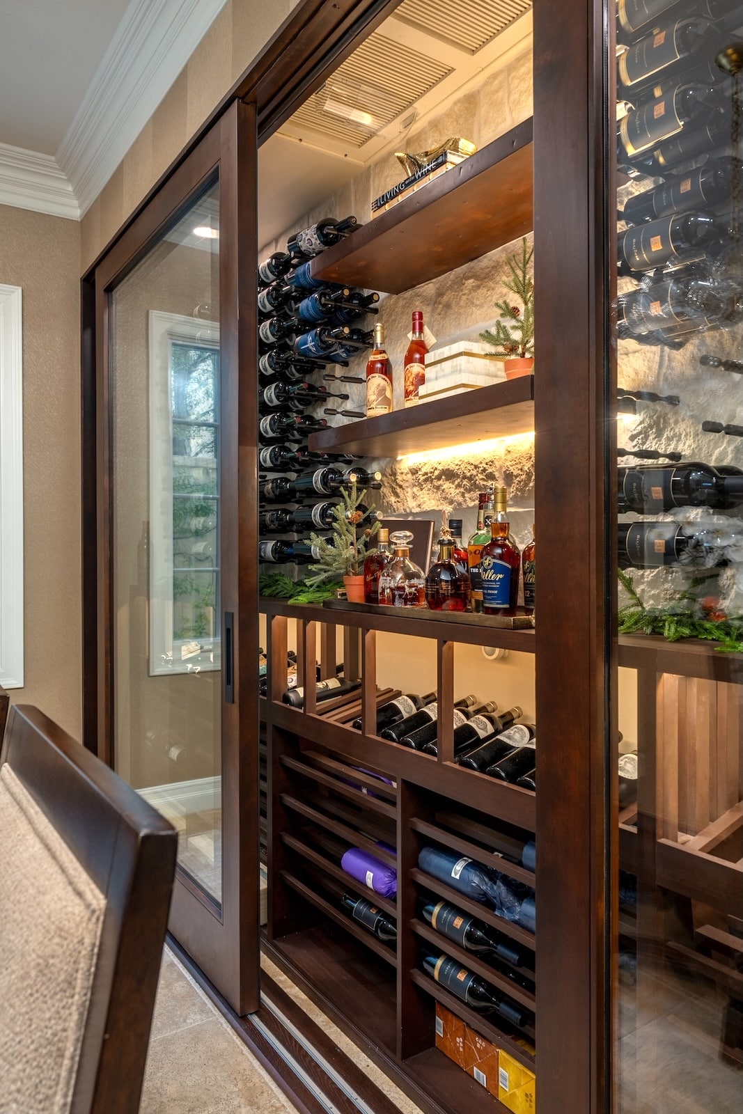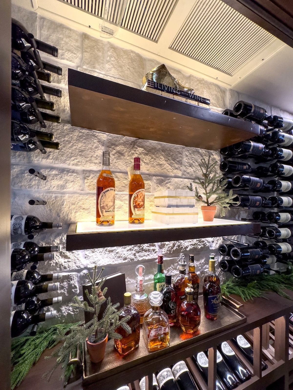 But building this cellar didn’t come without its challenges. Originally, the room wasn’t set up for wine storage at all. In fact, it required a complete transformation. The archway had to be moved, and the walls stripped down to the studs. The design team meticulously ran the line set just outside the room, installed a cooling unit, and completed the necessary electrical work. With the structural work done, we applied a fresh coat of texture and paint to the walls, followed by the installation of the stunning limestone wall and custom racking. Every detail was addressed to ensure both aesthetic beauty and functional excellence.