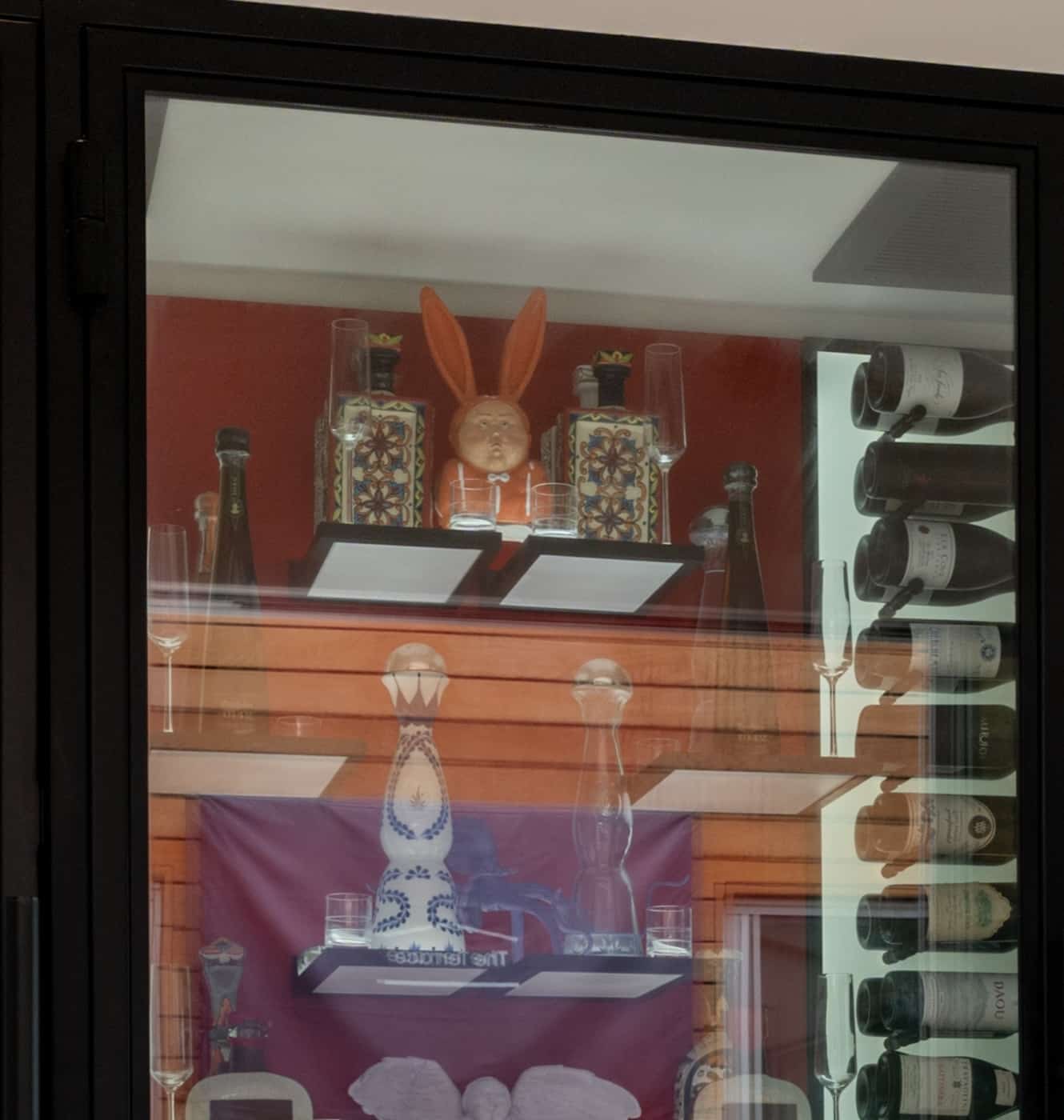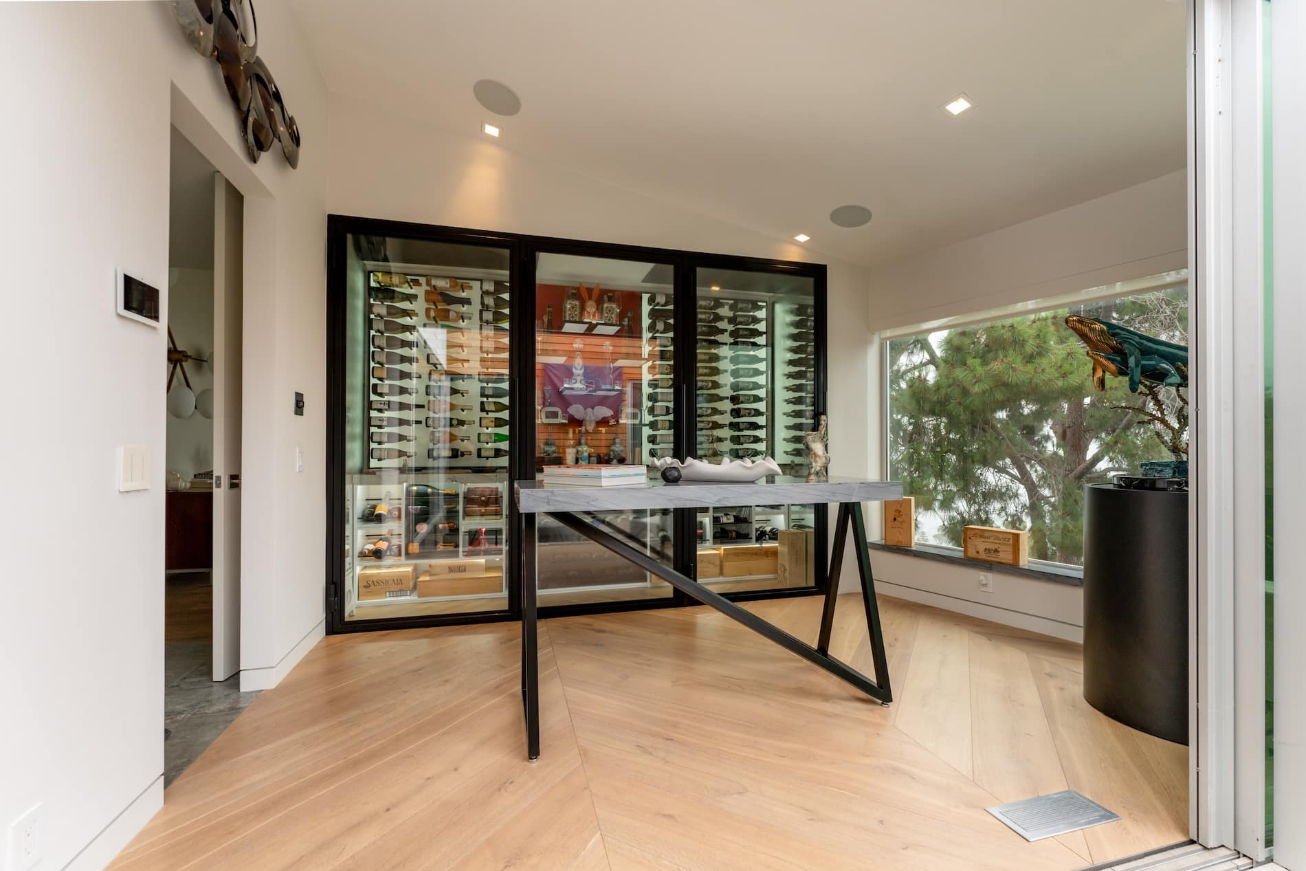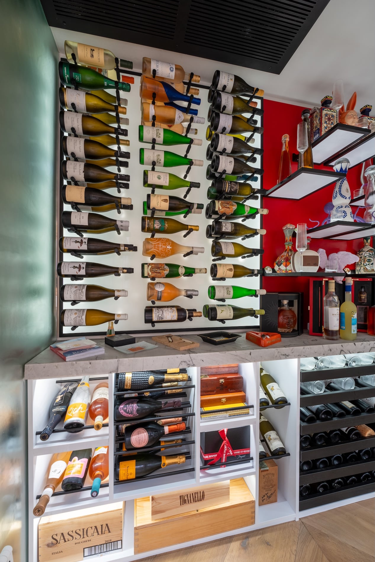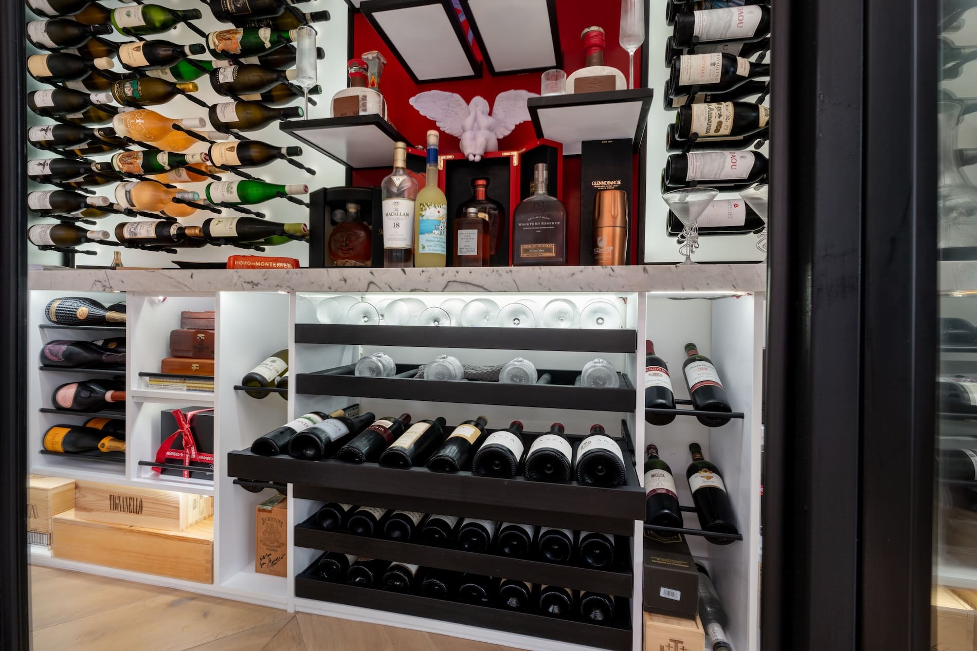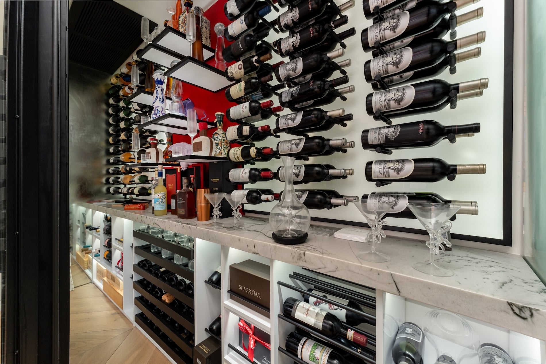 The moment you slide open the black metal–framed glass doors, you know this is more than just storage. The wooden flooring feels warm underfoot, the lighting is soft and welcoming, and a marble countertop runs the entire length of the cellar, tying the space together with a sense of simple elegance.
