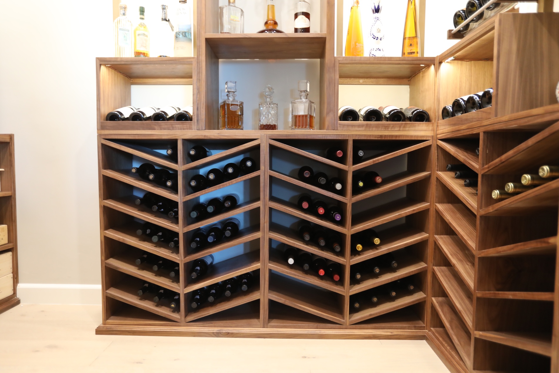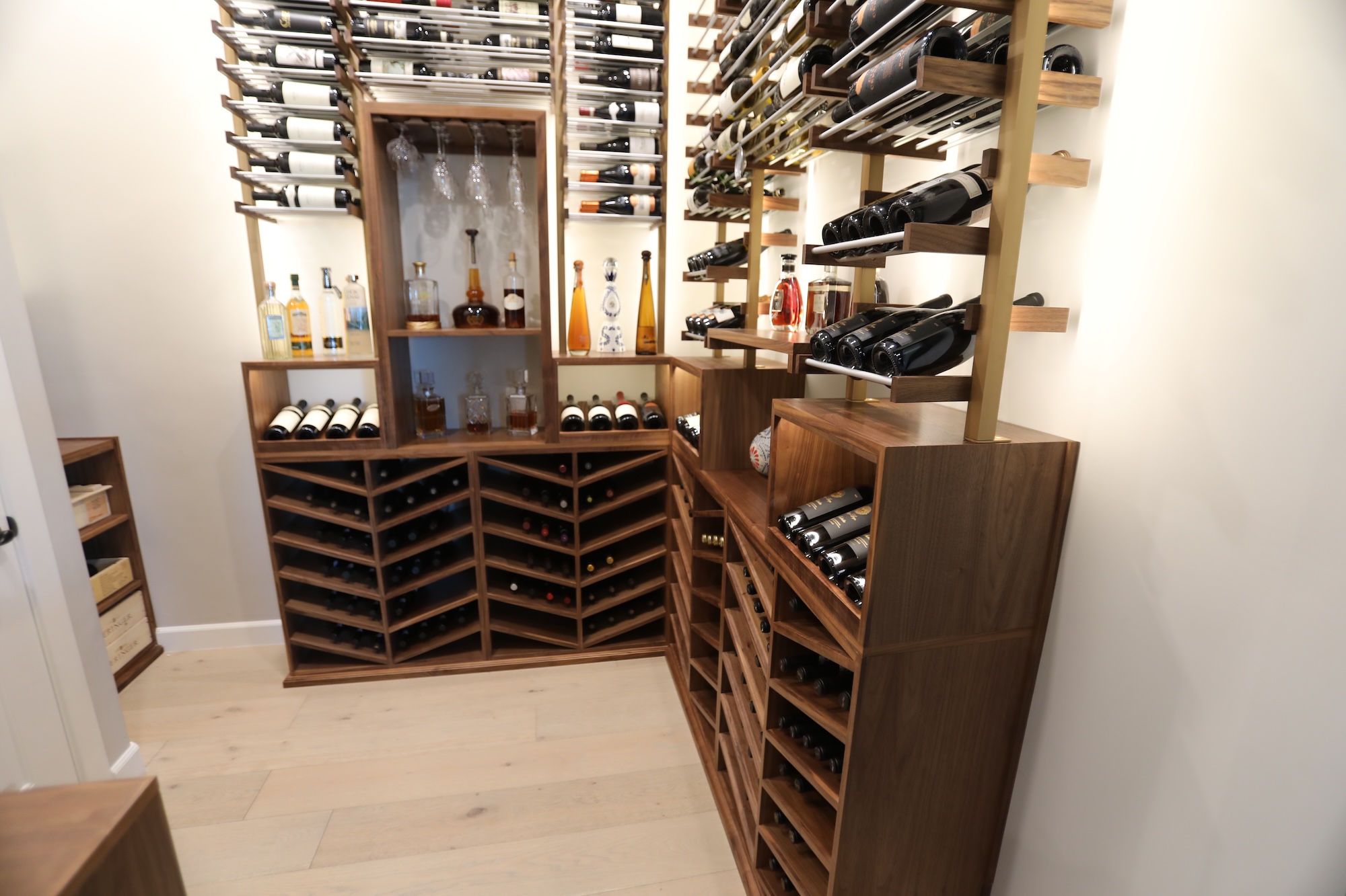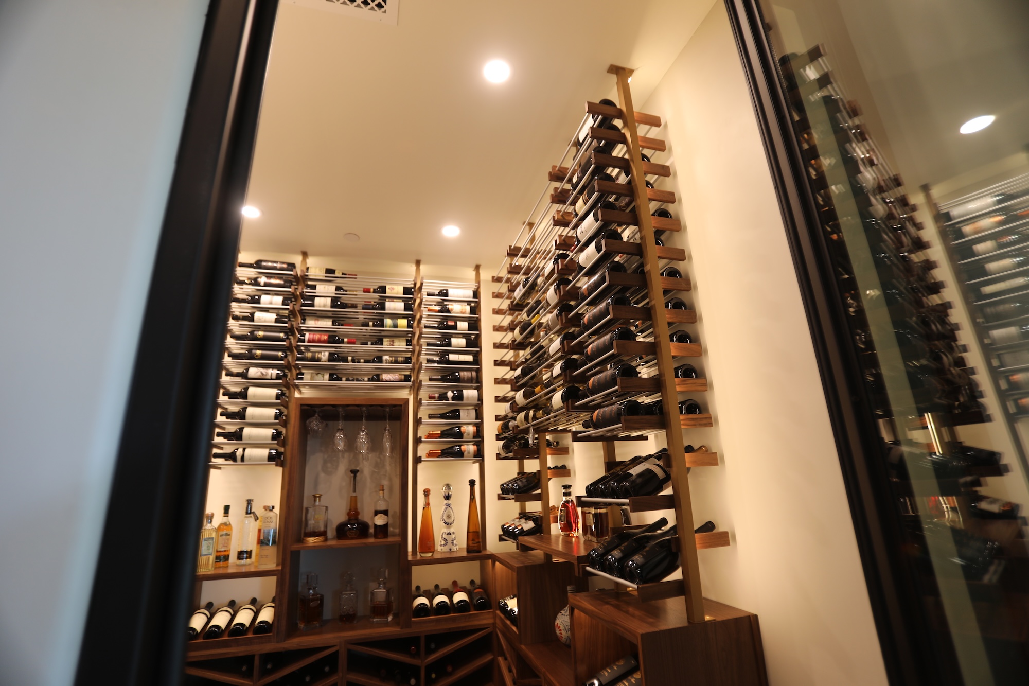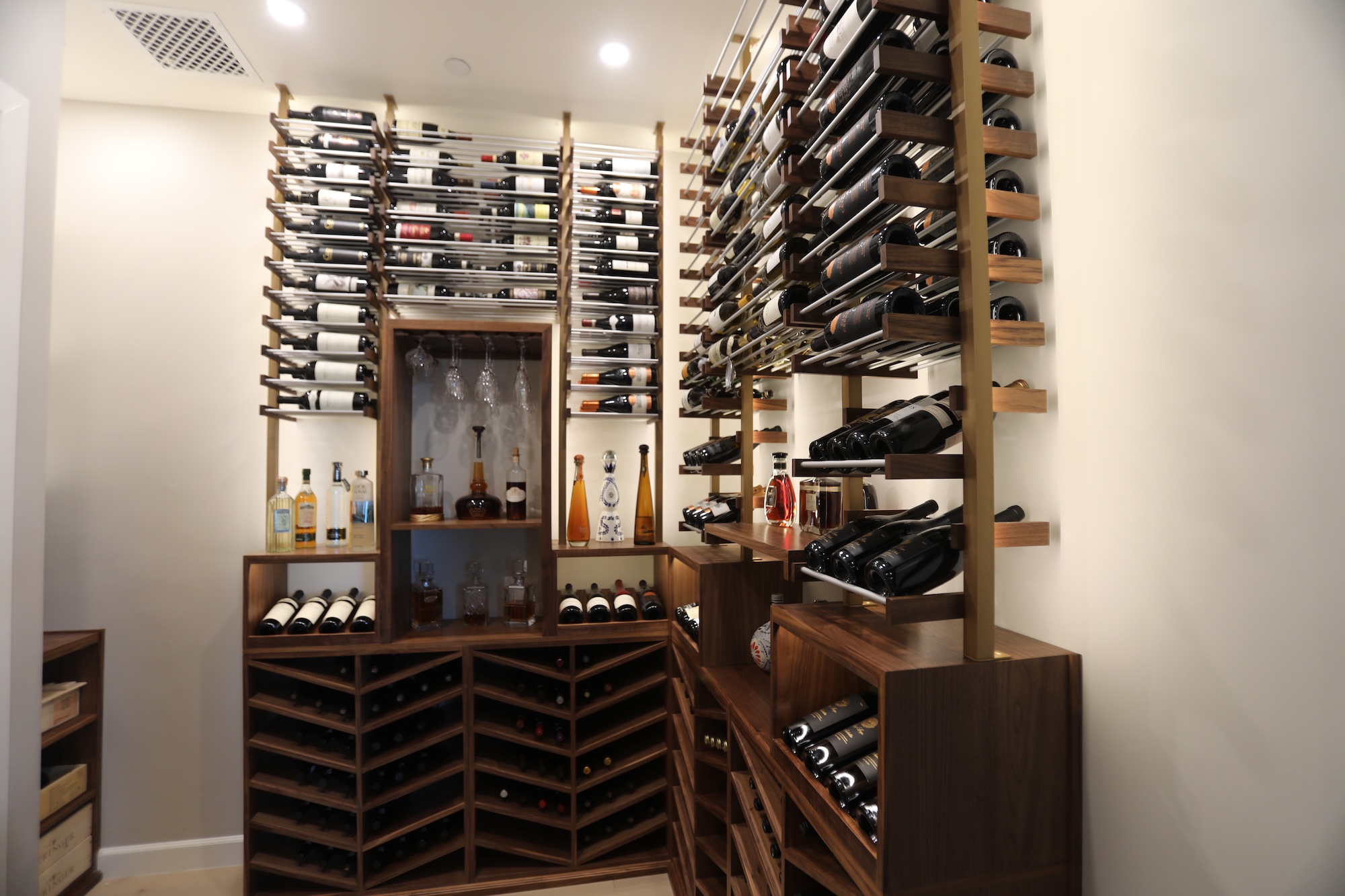 Step inside one of our signature custom modern wine rooms, where clean lines, warm walnut tones, and sleek metal detailing come together in a space that feels both refined and inviting. Designed to maximize storage without overwhelming the footprint, this room proves that modern wine storage can be architectural, functional, and effortlessly stylish all at once. It’s a perfect example of how custom modern wine rooms can transform an everyday corner of the home into a statement-worthy destination.