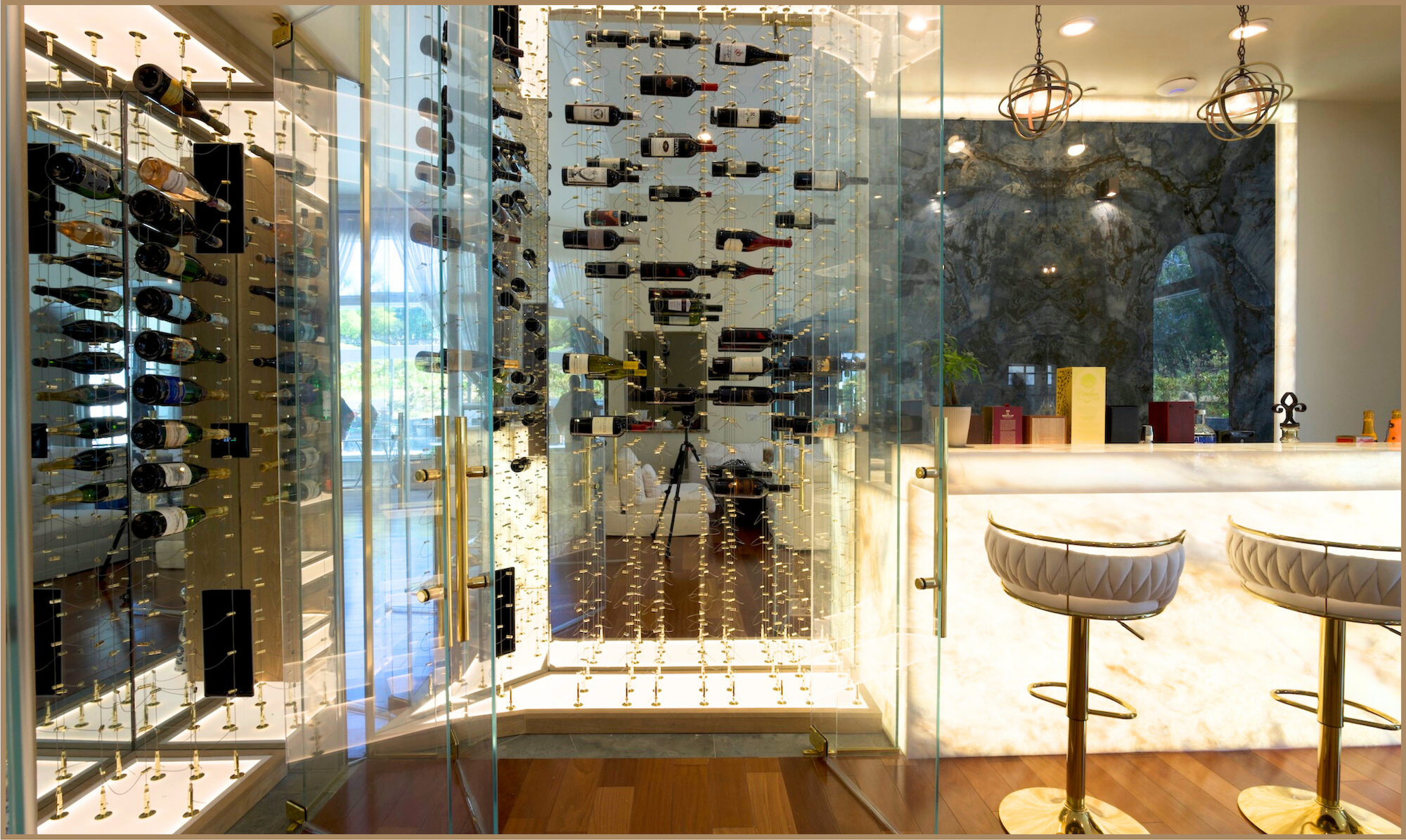 You are welcomed with full coverage of the magnificent display of wines through a huge frameless glass with two panels and a glass door on the left to enter the wine cellar and cigar humidor.
